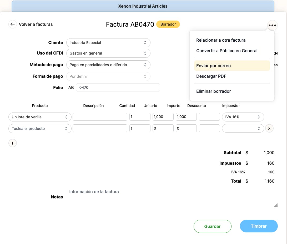 Tus borradores son tus cotizaciones y los puedes enviar por correo o descargar como PDF.