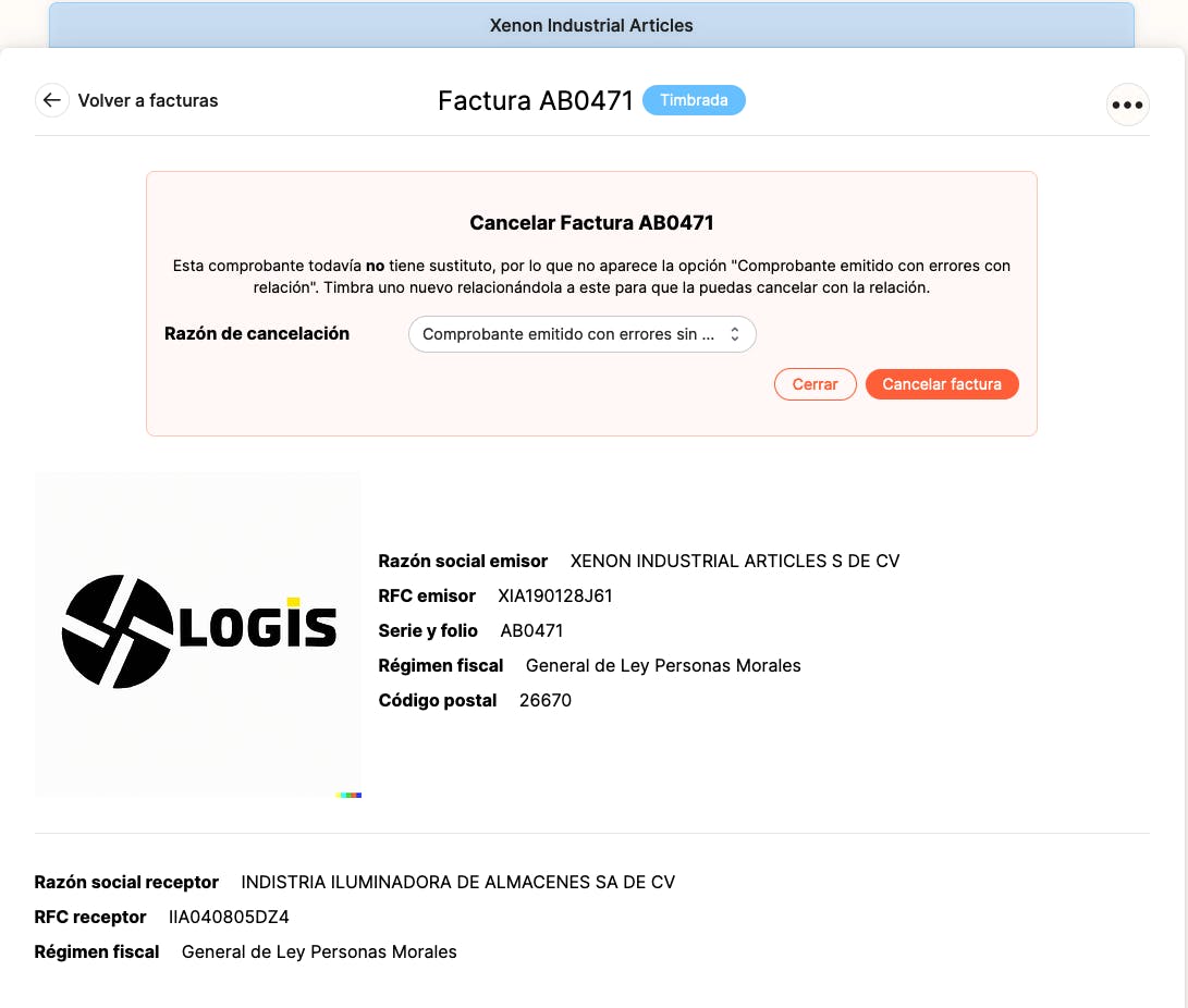 Cancela ambos comprobantes rápidamente y/o revisa su estatus ante el SAT. Si ha sido cancelado en otro lugar, también será cancelado en Avenda.