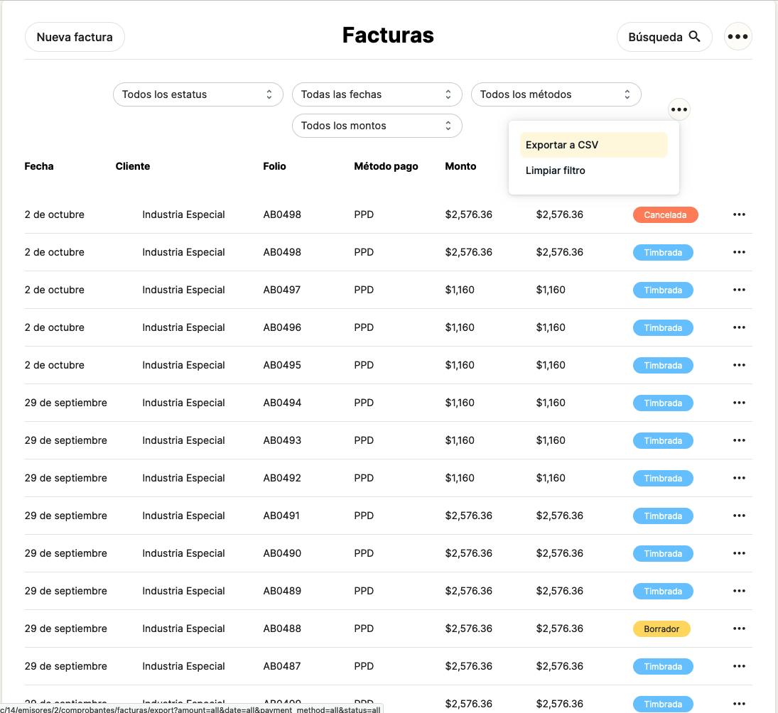 Exporta las ventas del filtro seleccionado a formato CSV (valores separados por comas), y lleva tu información a Excel o Google Sheets u otro lugar.