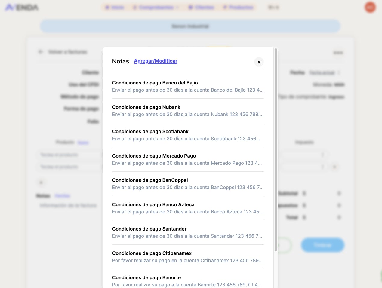 Agrega notas automáticamente a las facturas o selecciona de una lista de notas disponibles